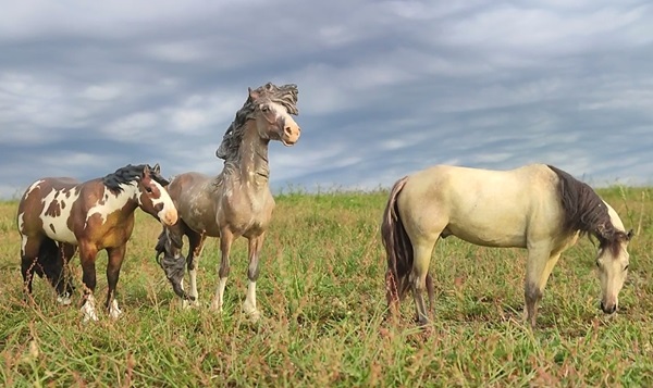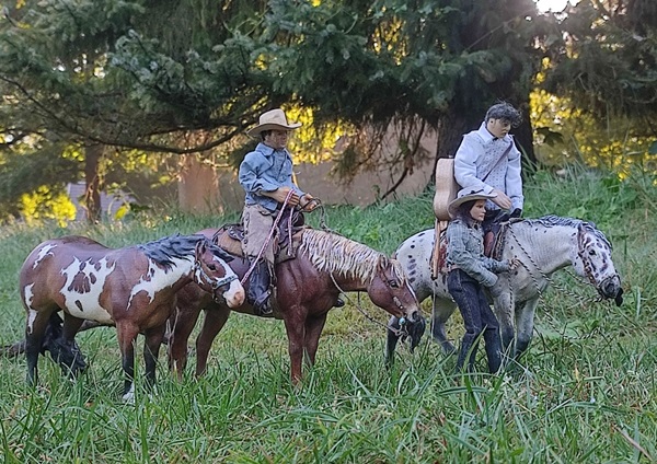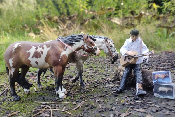 | 25. 4. 25 | Ranchnachrichten Bevor wir zum Ranchgeschehen kommen, noch ein Nachtrag. die PAM wird wegen der Dapples in der Mähne, die ich doch sehr witzig finde, nun restauriert , statt gecustet. Hier zusammen mit der von neulich, die ja auch vom Flohmarkt ist ![]() Und dann hatten sich Leute über den Namen Cocaine Reflection gewundert, nun , der kommt, weil er von Same of Cocaine abstammt, dem Stammvater der Sabino Paintlinie bei mir. Und da dieser doch so wichtig ist, hab ich dafür gesorgt, daß er nun auch wieder als Modell existiert ( Bar Addictive Resin, neu bemalt) ![]() Und nun gehts raus ![]() ![]() Gene erzählte uns, daß Bebop ihren Schwanz verloren hat vor Schreck, also so ähnlich wie bei Ey-Ore. Aber nicht durch das Rumgeballer, sondern weil sie danach den Tierarzt mit der Wurmkur trafen. ![]() Sie gingen ihn suchen, Milow findet ja fast alles ![]() Er schien jedoch ratöos zu sein. Dafür fanden sie im Gebüsch eine tolle blaue Glaskugel ![]() ![]() ![]() Am Sandwash Hole trafen sie dann einen Frosch, der sagte:" Wehe, wenn Ihr die Kugel in den Teich fallen lasst!..." ![]() "....weil: wenn ich die Euch dann wieder rausholen soll, müßt ihr mich küssen!" Nee, das wollten wir ja nicht, so süß der ist. ![]() ![]() Als nächstes brachte Milow freudestrahlend Bebops Schwanz an, er hatte ihn auf der Innenseite meiner Tasche festhängend gefunden XD ![]() Dann können wir den Ausritt ja fortsetzen ![]() |