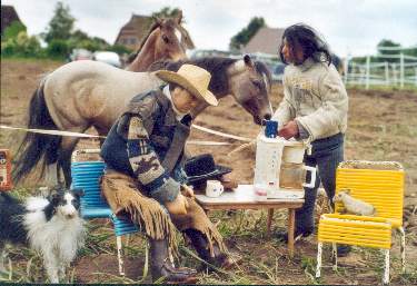 | Hier gönnen sie sich erstmal ne Kaffeepause am Seilpaddock. Die Kaffeemaschine kann übrigens an die E-Zaunbatterie angeschlossen werden..... Danach fuhren wir zur Stutenschau auf Gestüt Moorredder. |