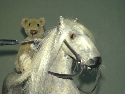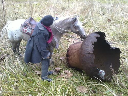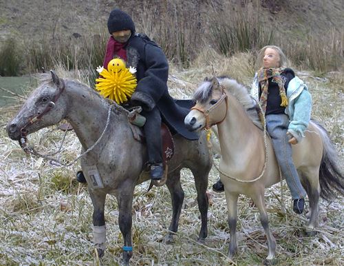 | 27. 6. 15 | Ranchnachrichten Heute waren Jean und Dan auf einem Markt,einen Wagen für Cheyenne kaufen, den sie schon seit längerem im Auge hatten Jean machte dann ne Probefahrt Die hier waren auch unterwegs in große Abenteuer, ggg Unterwegs gabelten wir ein Fallabellafohlen mit ebenfalls großen Springambitionen auf Sie ritten dann weiter Ui, heute war offenbar "Bad-hair-day" (Der Puschel stammt auch vom Flohmarkt, bei der Frise konnte ich einfach nicht wiederstehen , obwohl ich diese Art Pferde garnicht sammel ggg ) Er heißt Pusteblume |